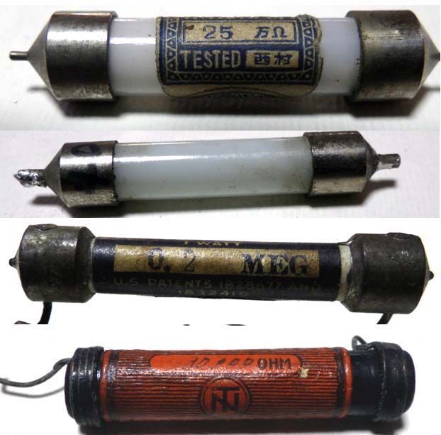 | ラジオ受信機の初期、抵抗器は高価な部品でした。 抵抗値の低いものは、細い抵抗線をボビンに巻いたり、発熱の大きいものは焼き物の筒に巻き付けて作りましたが、グリッドリークなどの高抵抗は苦労したようです。 カーボン被膜抵抗は被膜の安定が悪く、高い抵抗値のものはすぐに壊れてしまいました。 画像でお見せするのは長い寿命を目指して工夫された「抵抗器」たちです。 * |