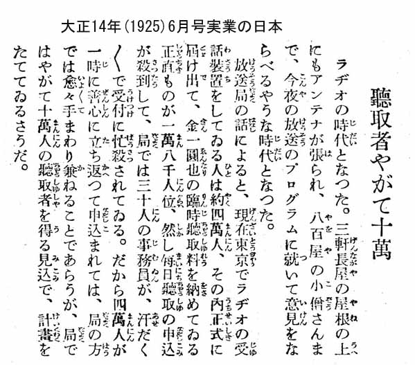 | 放送は最初”商業”としてスタートしたので、 会社と政府との間で様々のドラマが展開されました。 (朝日年鑑、毎日年鑑記事より抜粋整理) ラヂオ放送開始ドキュメント * 「ラジオ聴取者がやがて十万に」の雑誌記事 |