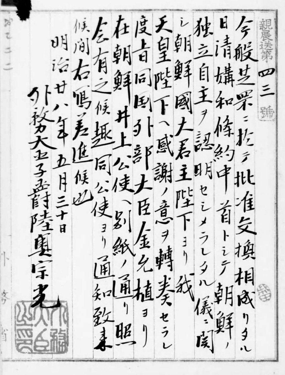 総合目次へ 歴史のページへ * 戦後教育を受けた私たちは、「昭和20年以前の国際的な行為はすべて日本が悪い」と教えられてきました。 * 今日の産経新聞に、日清戦争に勝利して、韓国の自主独立を成し遂げた「日韓講和条約」に対し、「朝鮮国大君主陛下」から、 我が国の天皇陛下に対して感謝の意を伝えた旨の記事があり、少し考えさせられました。 * * 上の「感謝状」は国立公文書館からのダウンロード 下の画像はウイキペディアから拝借しました。