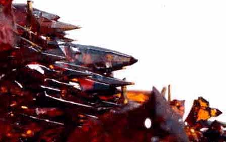 上の紅亜鉛鉱人工結晶を部分拡大すると検波器として利用できる針状結晶が見える