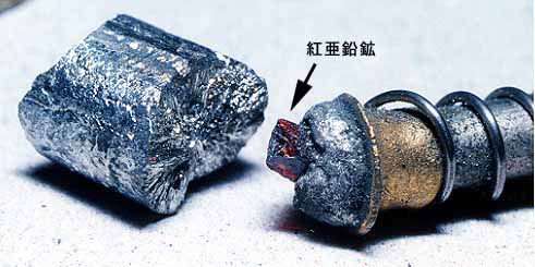 検波器は紅亜鉛鉱とアンチモンと思われる鉱石を組み合わせたもので、