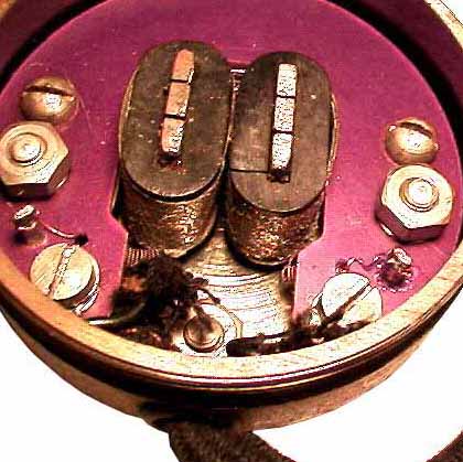 U字を逆さまにしたような形で周囲を取り巻いているのが 永久磁石です。 コイルは二つあってお互いに協力して磁力を強める方向に 接続します。 鉱石ラジオで聞く場合には接続する極性(+ -) は関係ありませんが、真空管式ラジオで聞く場合には コイルには音声電流(交流)とプレート電流(直流)が 同時に流れますので、永久磁石の磁力を強める方向に (+ -)を接続しないと、磁力が徐々に弱くなって、 長い間使っていると音が小さくなってしまいます。 ![]() |