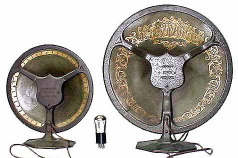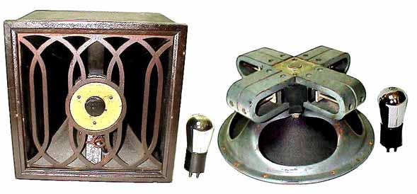 右側の馬蹄形磁石を8個も接続したスピーカは、強力な永久磁石の無かった時代に