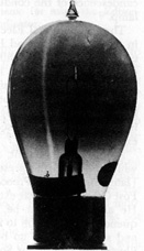 参考文献エジソンが作った電球はフィラメントに竹の繊維を使用し 電源は現在のような交流ではなくて、直流で点灯されました。 * 電球は長く点灯していると、次第にガラス内面が黒くなって 暗くなり、ついには断線してしまいます。 * 断線した電球を良く見ると黒くならない透明の一本の縦線が 見えることに気づきました。 * 詳しく調べてみると、断線するのはフィラメントのマイナス側で、 マイナス側から見てプラス側フィラメントの影になる部分に透明 の縦線の現れることが解りました。 * カーボンのフィラメントが蒸発してガラス内面に付着するとき 何等かの電気的な力が働いているのでは?と考えたのが 真空管誕生のきっかけでした。 *