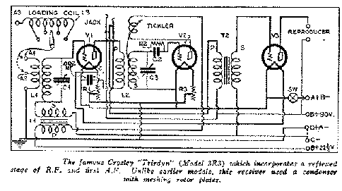 CROSLEY Model 3R3 製造国:アメリカ 製造者:Crosley Manufacturing Co. 発売時期,定価 :不明(未調査) 回路方式:レフレックス方式 3球再生式受信機 使用真空管 高周波&低周波増幅:UX-201 再生式グリッド検波:UX-201 低周波増幅:UX-201 高価な真空管を節約するため、高周波と低周波の増幅を1本の球で行わせる ”レフレックス”方式の 3球受信機です。 |